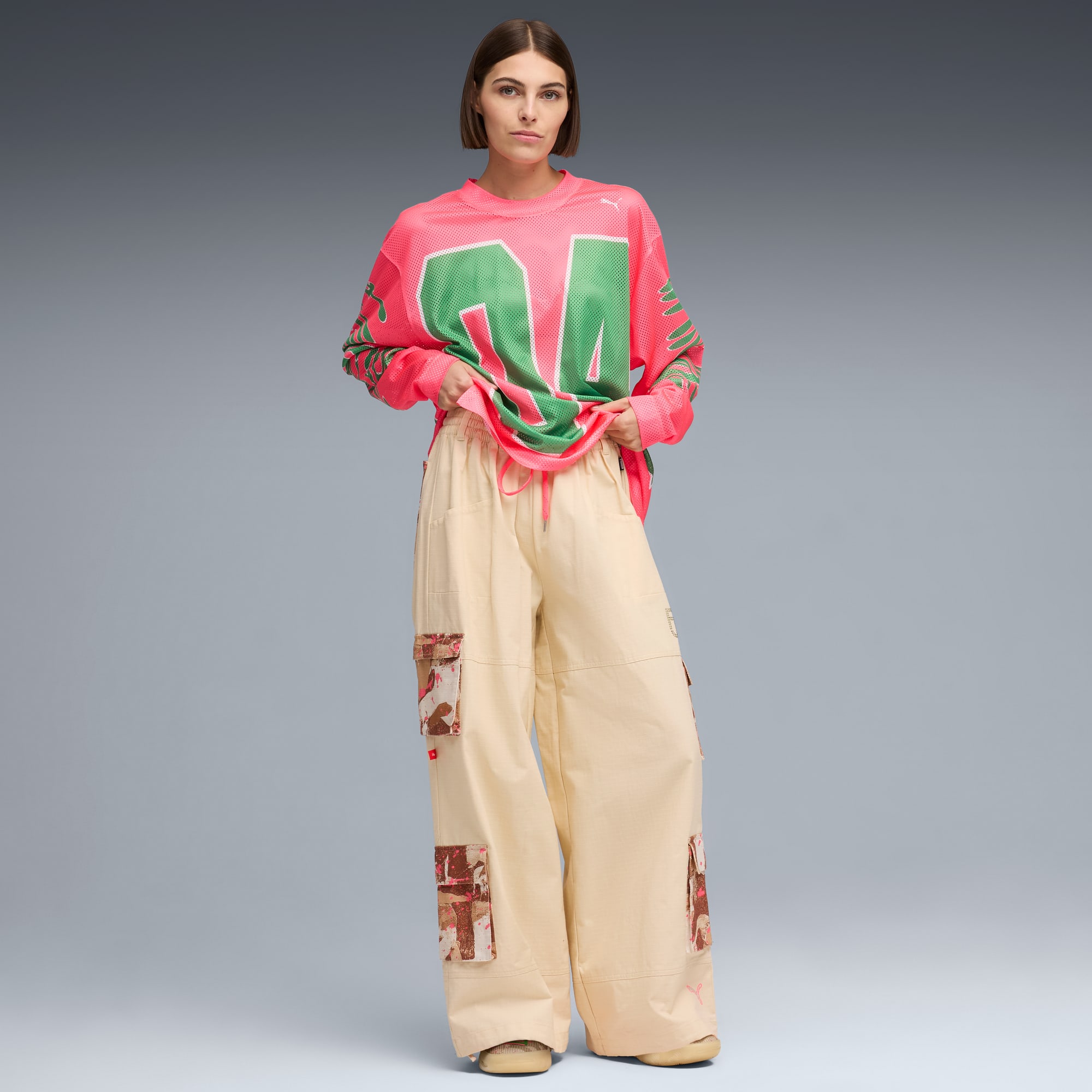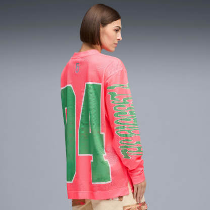 From the hardwood to the stage, Flau’jae commands attention. This apparel collection takes that same presence off-court, blending timeless design with bold personal detail like camo accents that pay homage to her late father, the rapper Camflauge. Wear this long sleeve jersey with skirts, track pants, or your favourite jeans.