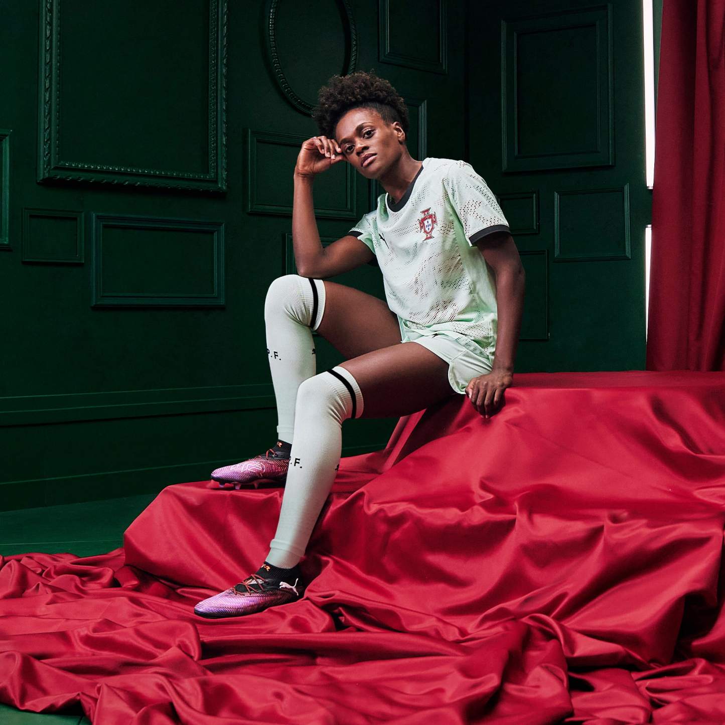 The future shines brightly in the Women's Portugal Away Kit. Bold graphics with red and green highlights are brought to life with motion to celebrate the intersection of art, technology, and football in modern-day Portugal. Designed for the fans, Replica jersey pairs the same match-worn look with a casual silhouette, details, and materials, ideal for both game day and everyday wear. This kit is made with RE:FIBRE, PUMA’s program to transform textile waste and other used materials into new textiles.