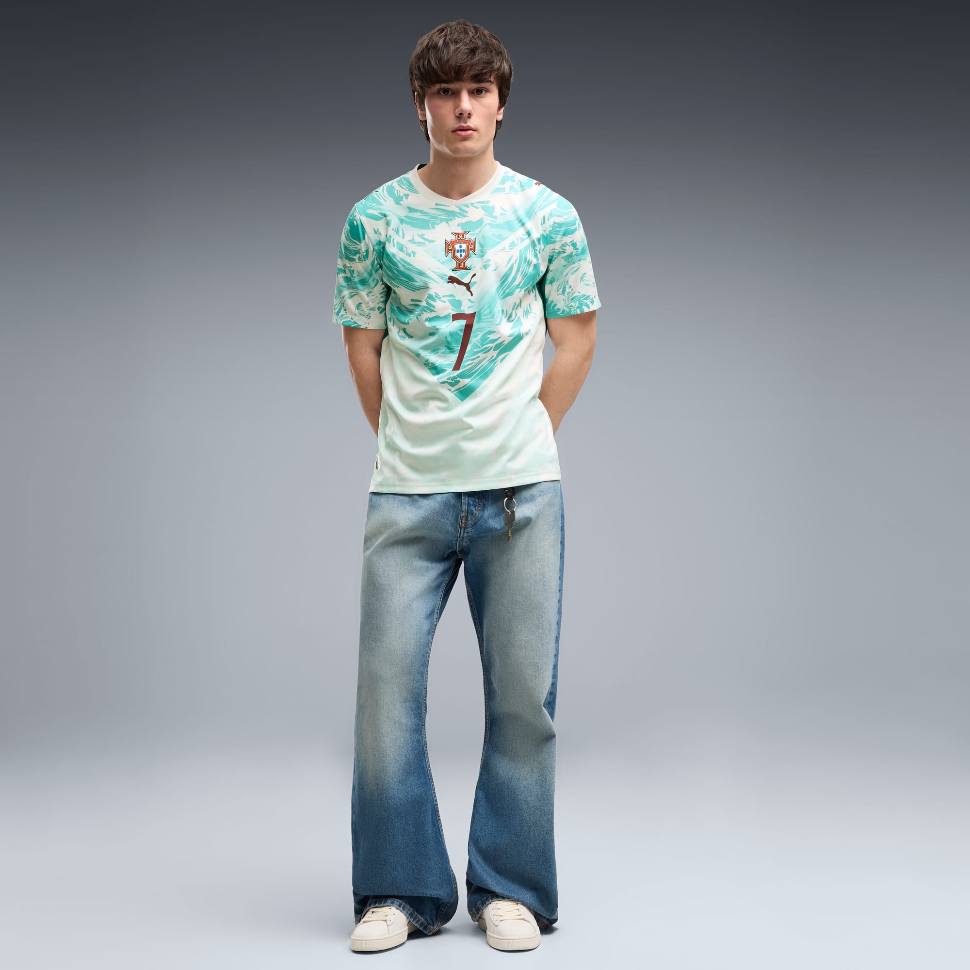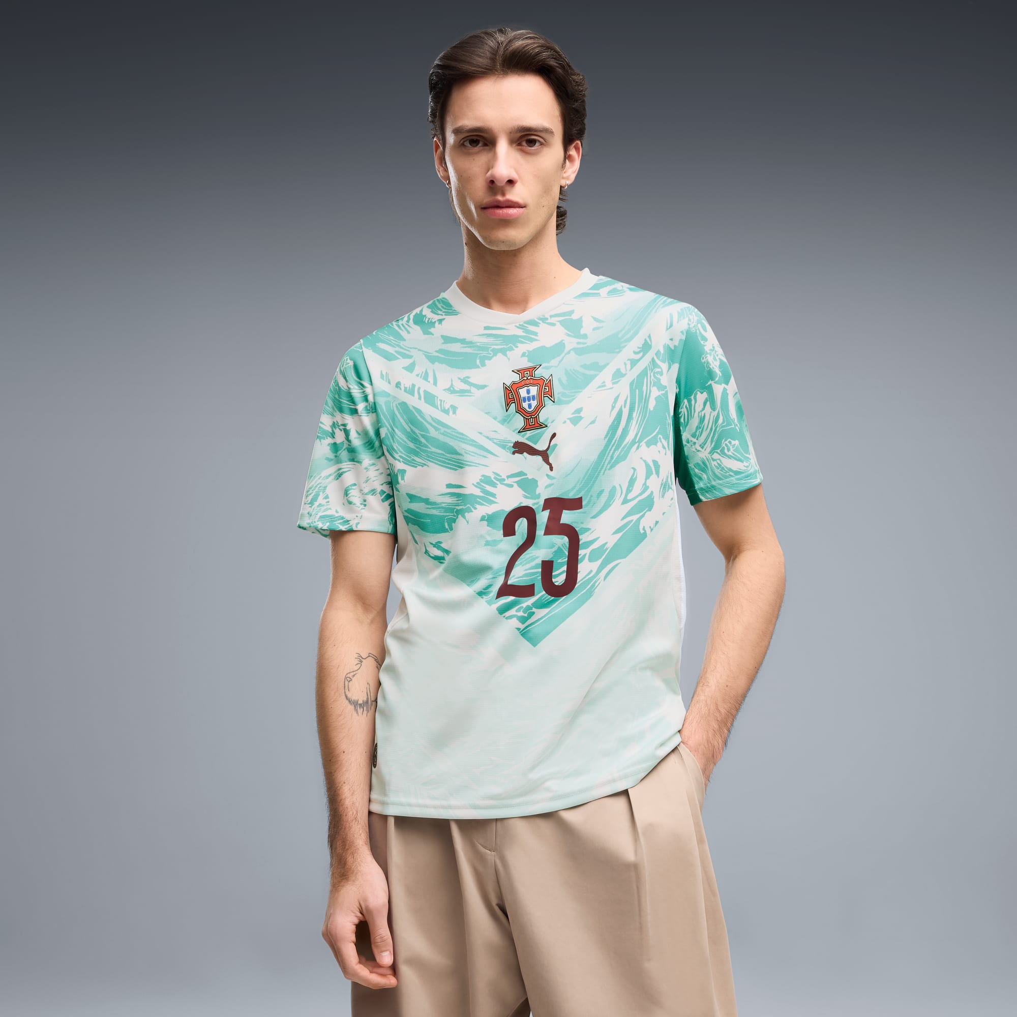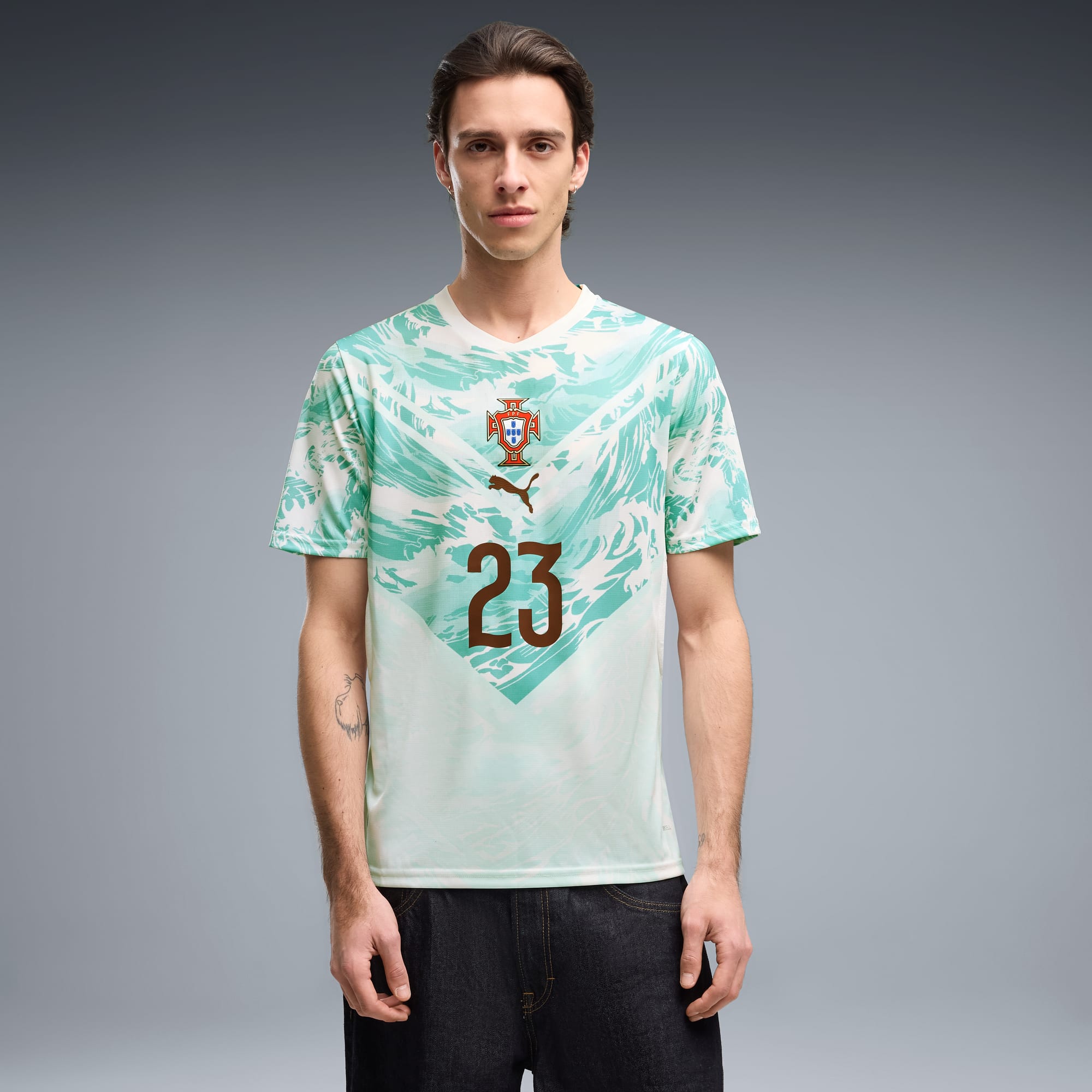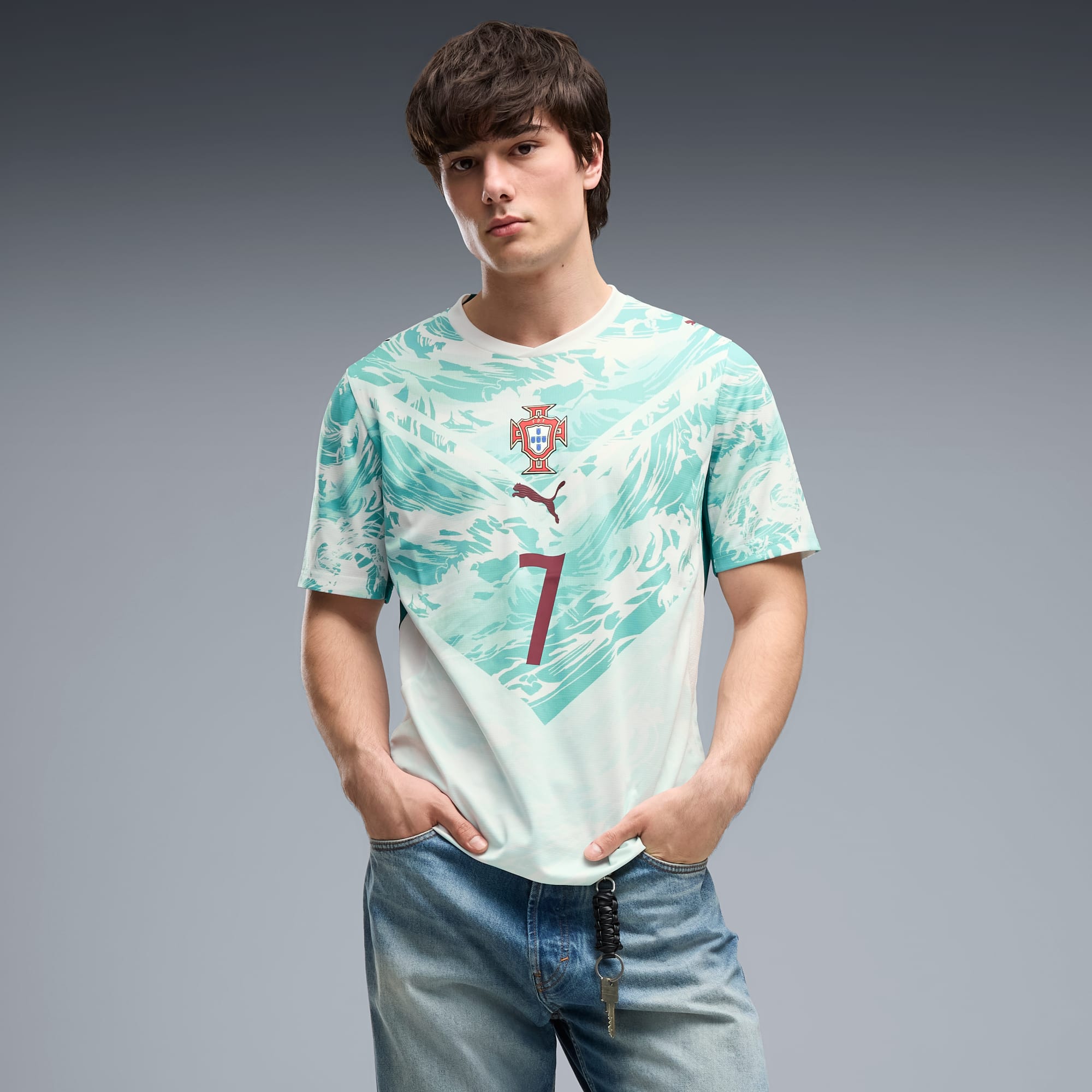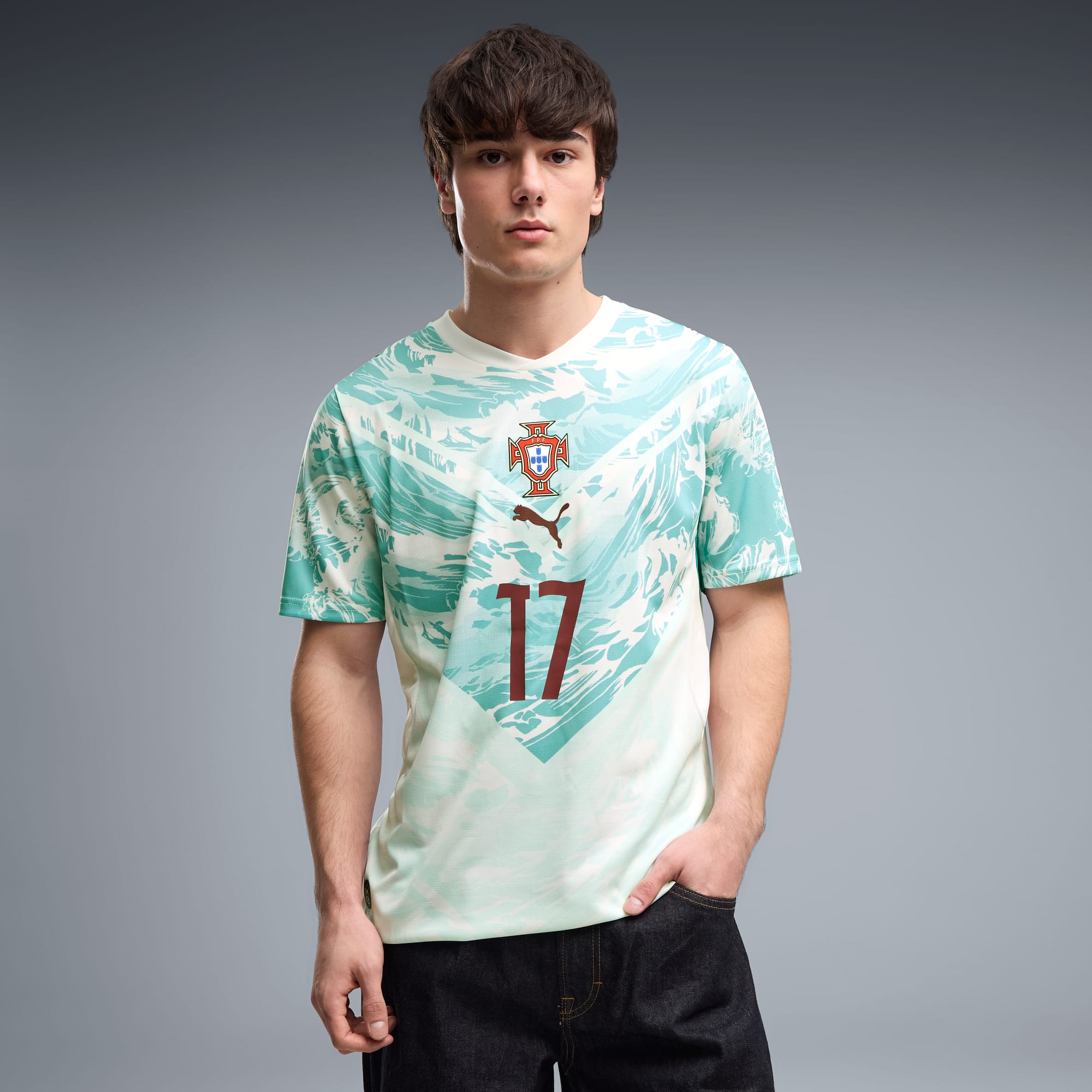 Inspired by the nation’s iconic players, Portugal’s Away Kit arrives in white and lagoon green that tie back to the ocean-inspired Home Kit. Designed for the world’s biggest stage, it connects generations who’ve given everything for the badge. This jersey pairs the same match-worn look with a casual silhouette, details, and materials, ideal for both game day and everyday wear.