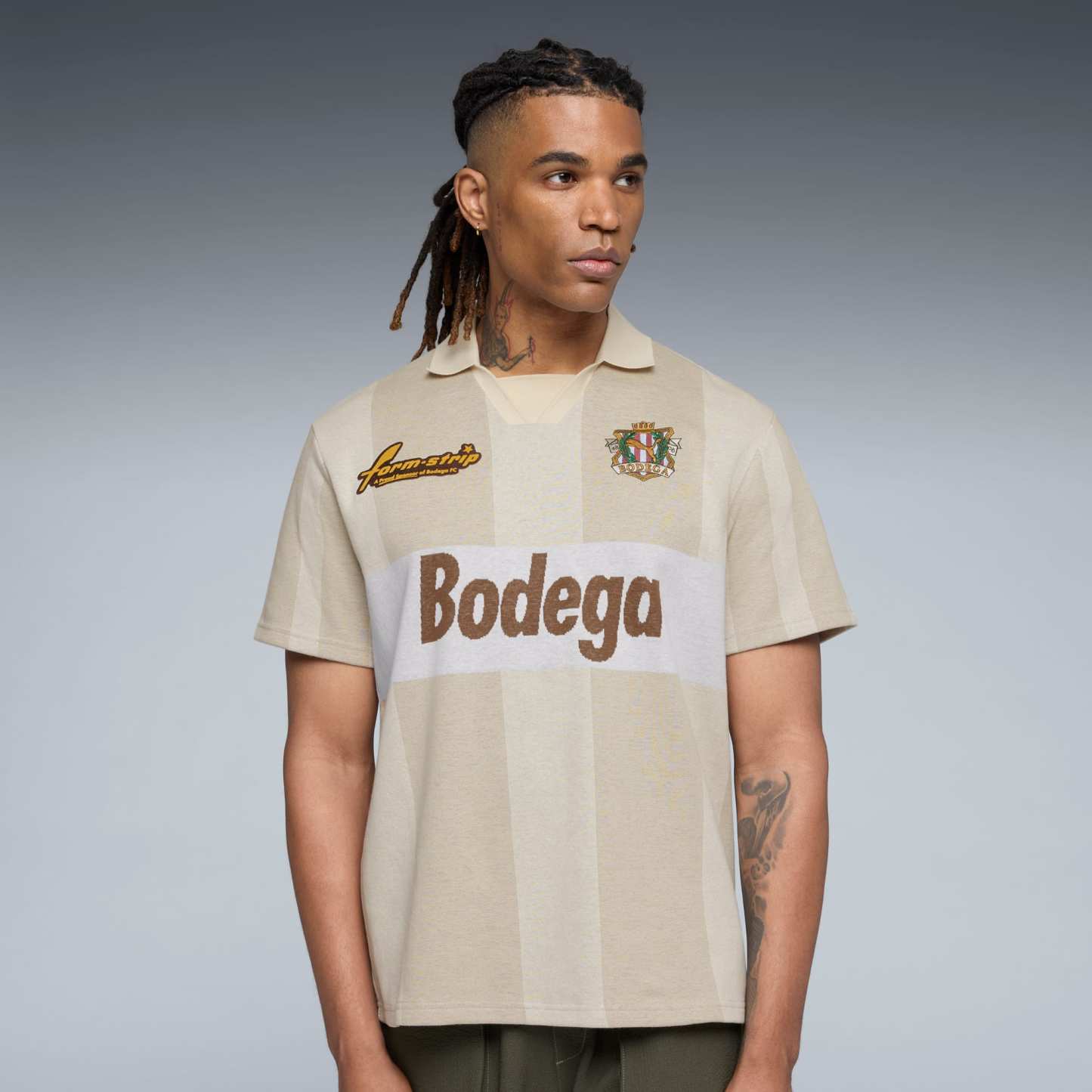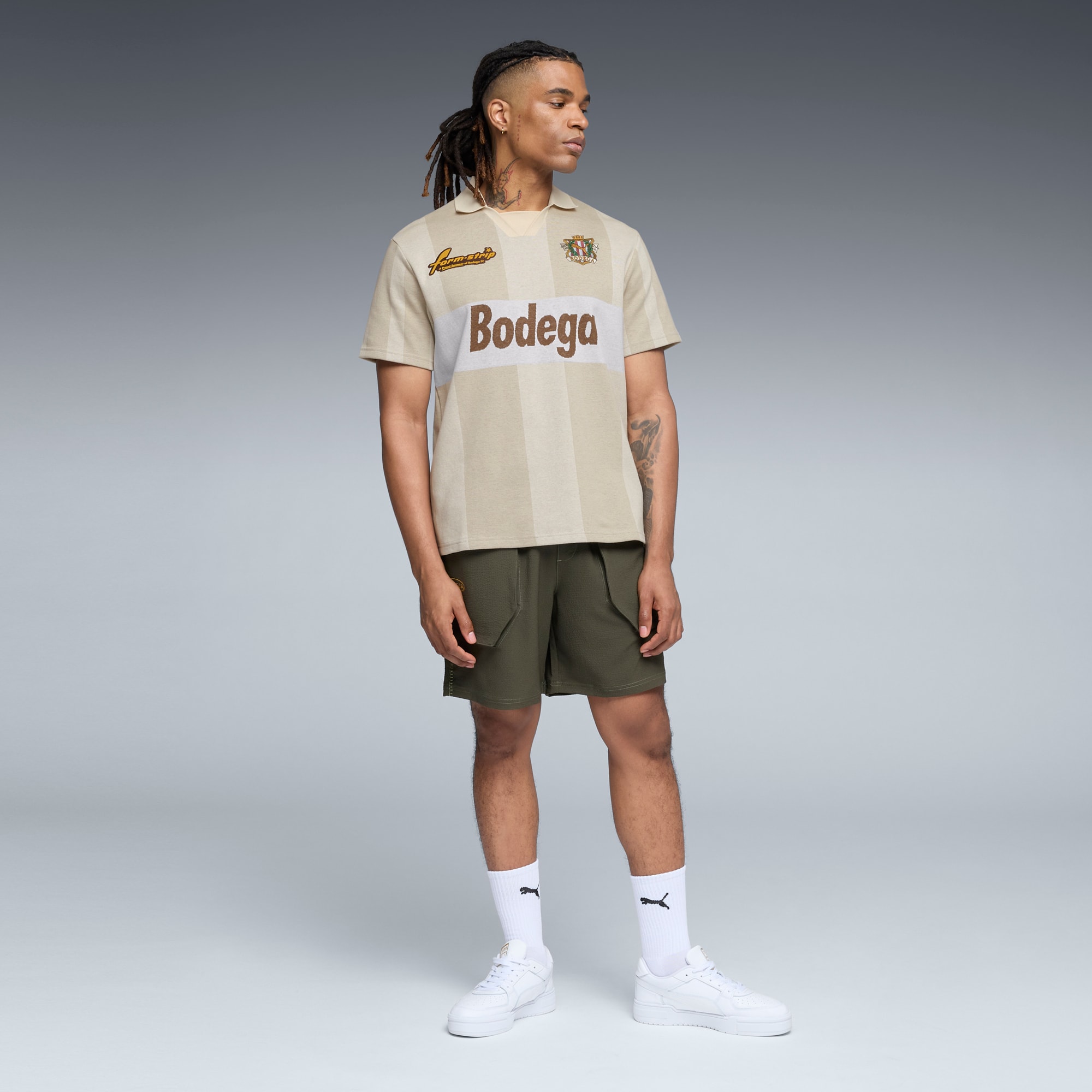 Designed with soccer fans in mind, this PUMA x BODEGA jersey features a standout “BODEGA” jacquard knit graphic adorned with a crest badge and Formstrip graphic at the chest, while an “06” graphic on the back pays homage to Bodega’s founding year.