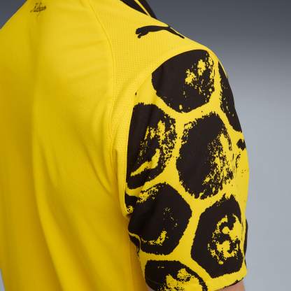 Derived from the geometric design of a honeycomb, this BVB kit is energized with painted hexagonal cells and dynamic lines. Stirring up a buzz from the Ruhr to Rodeo Drive, the jersey is part of the PUMA x KIDSUPER collection, where hand-drawn graphics, watercolor palettes, and designs rooted in club culture come together for a fresh take on the Beautiful Game.