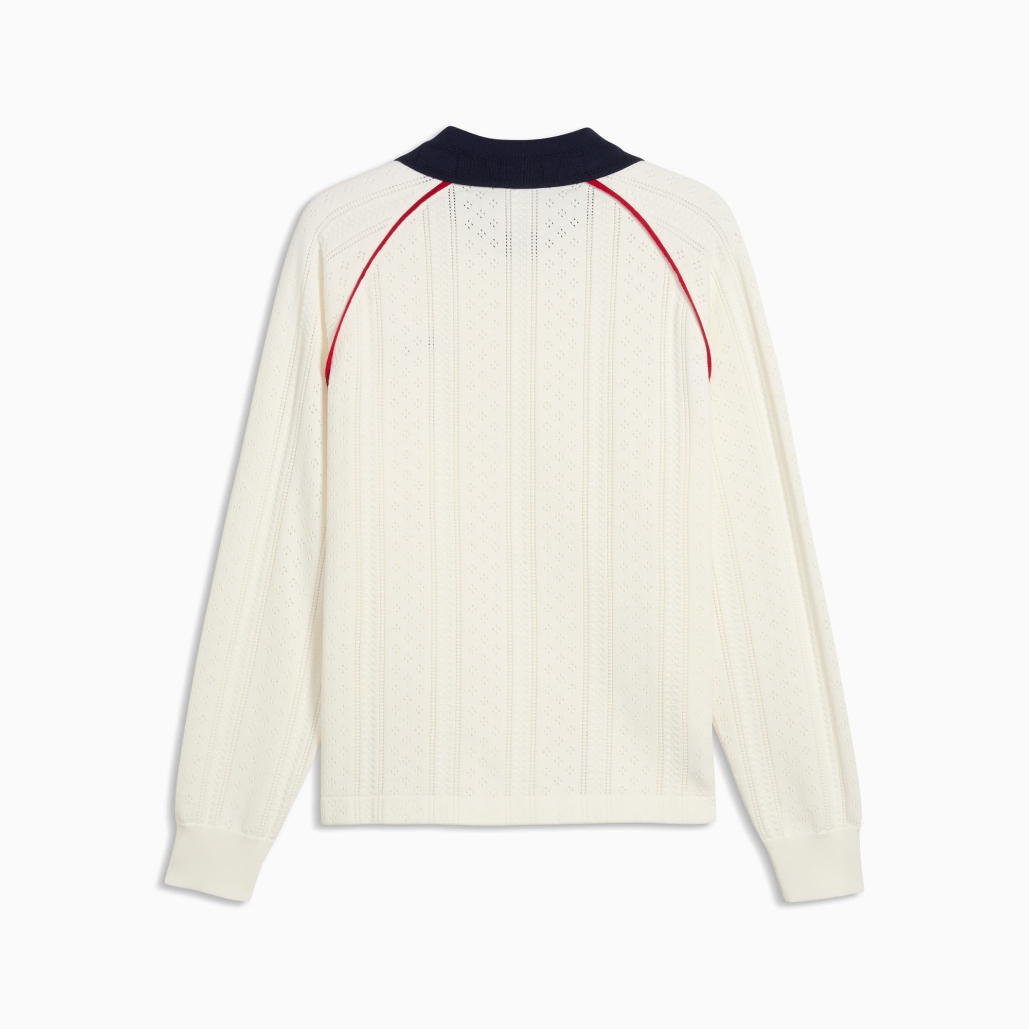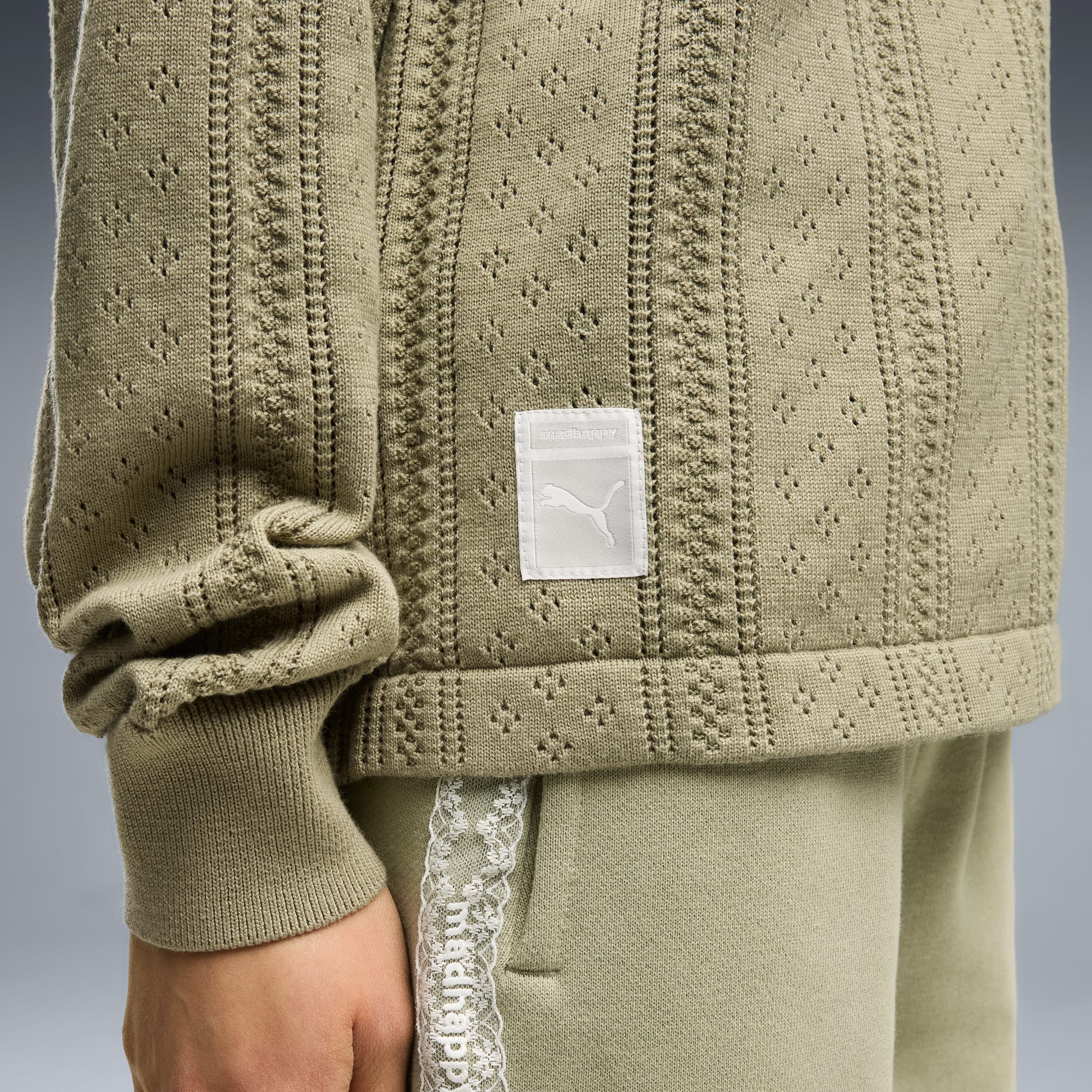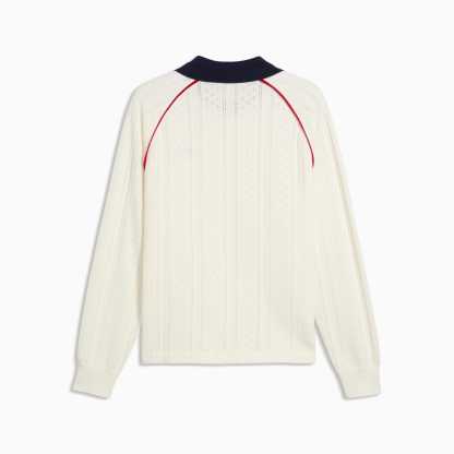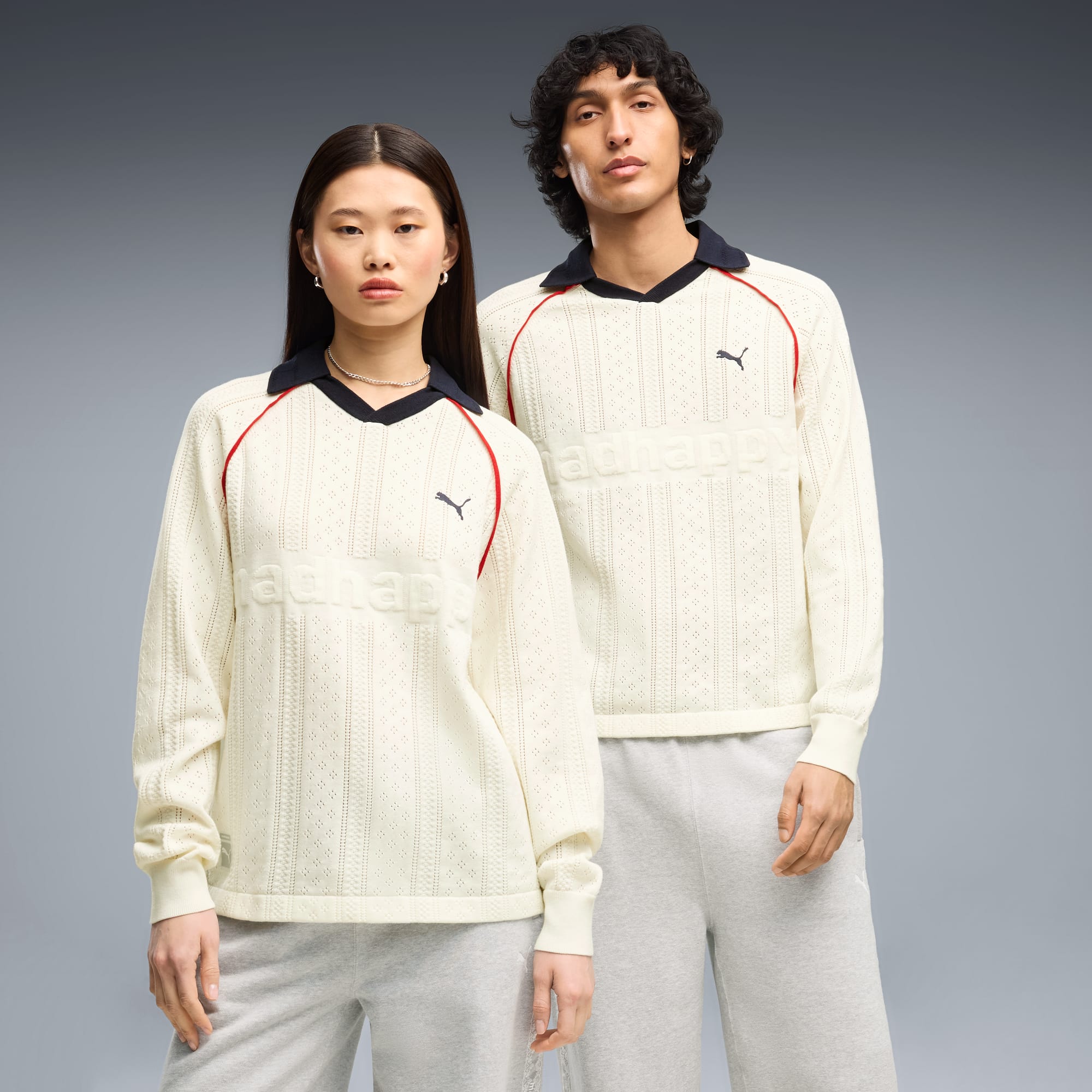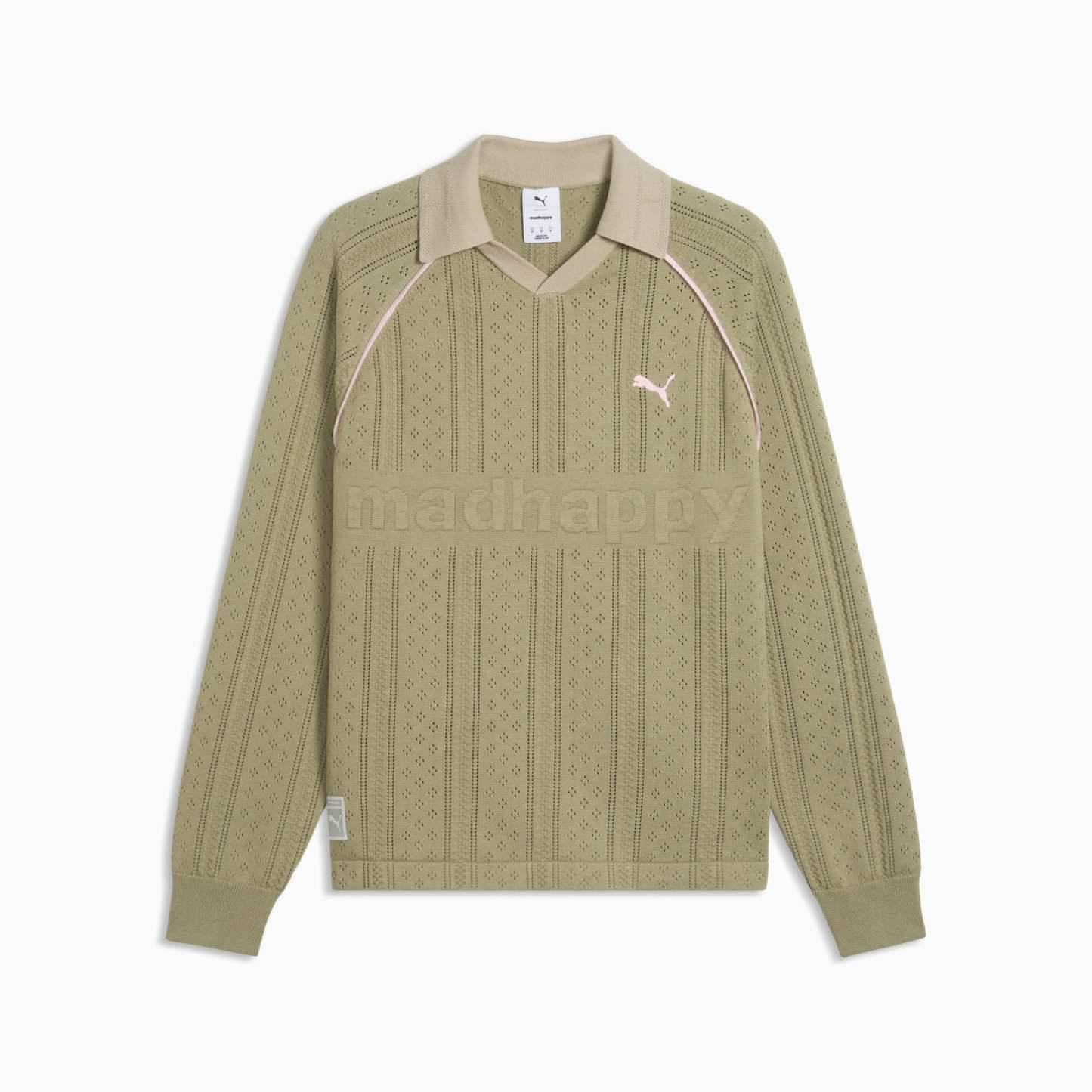 Good vibes only. The PUMA x MADHAPPY collection consists of classic sportswear and feel-good loungewear designed to lift the mood. Elevated details like pointelle and lace add softness and texture to athletic silhouettes. This long sleeve jersey brings that spirit to match-day style, reimagining a classic football jersey in soft and breathable pointelle knit.
