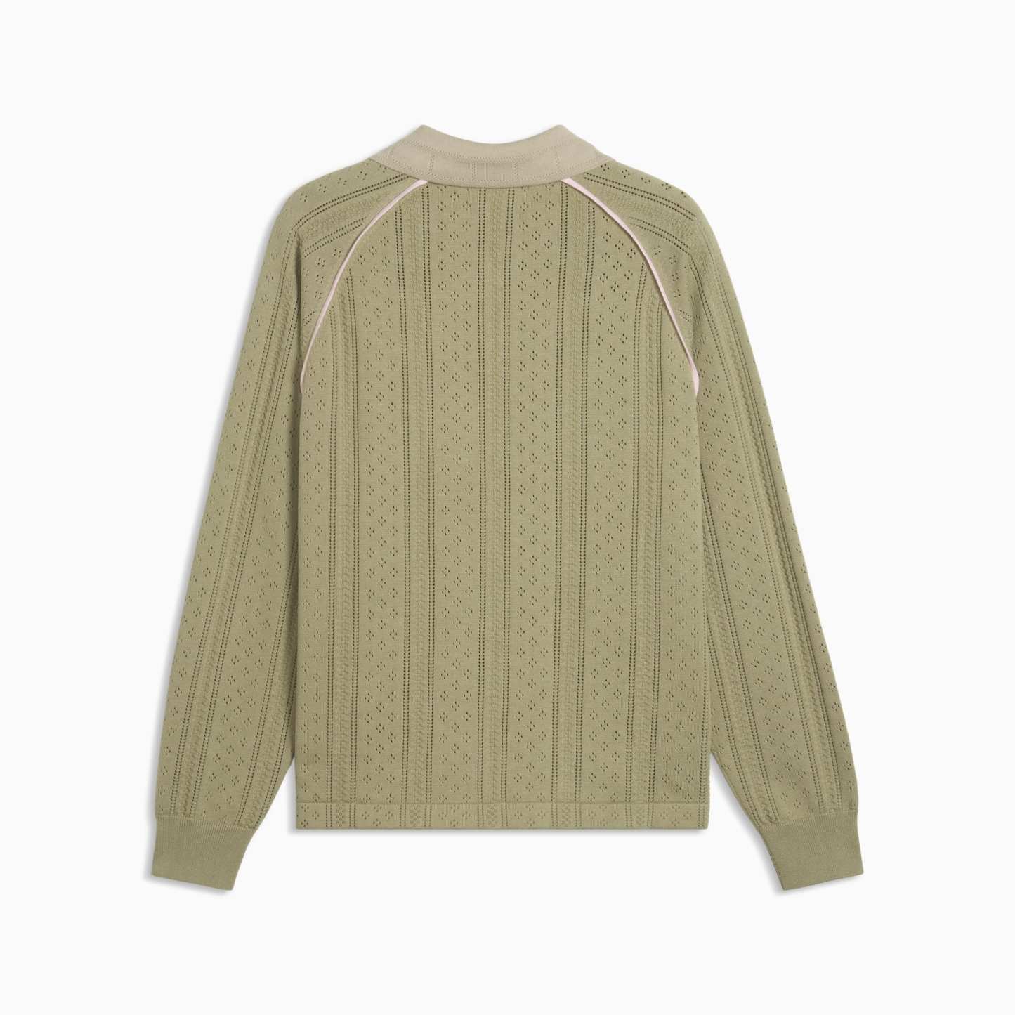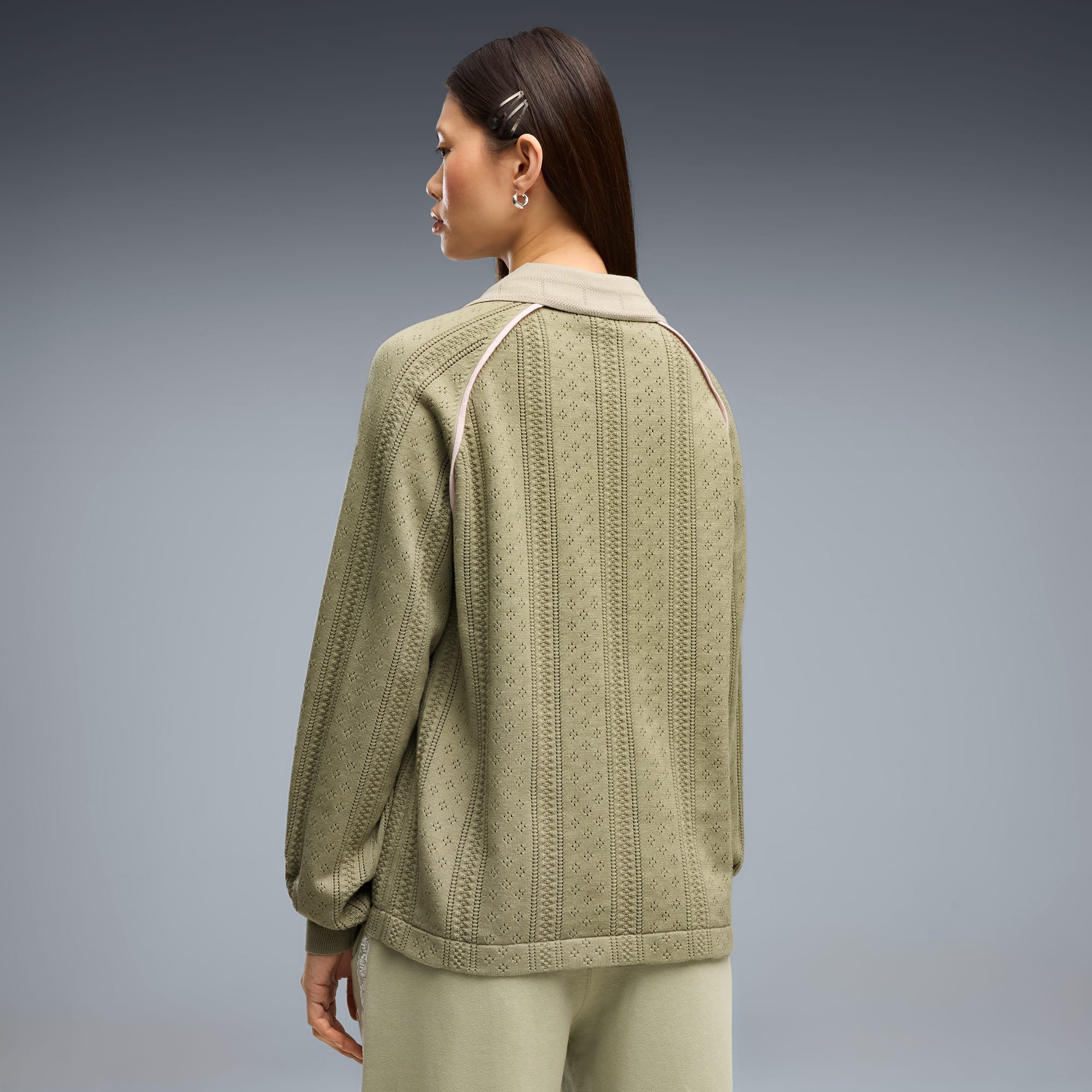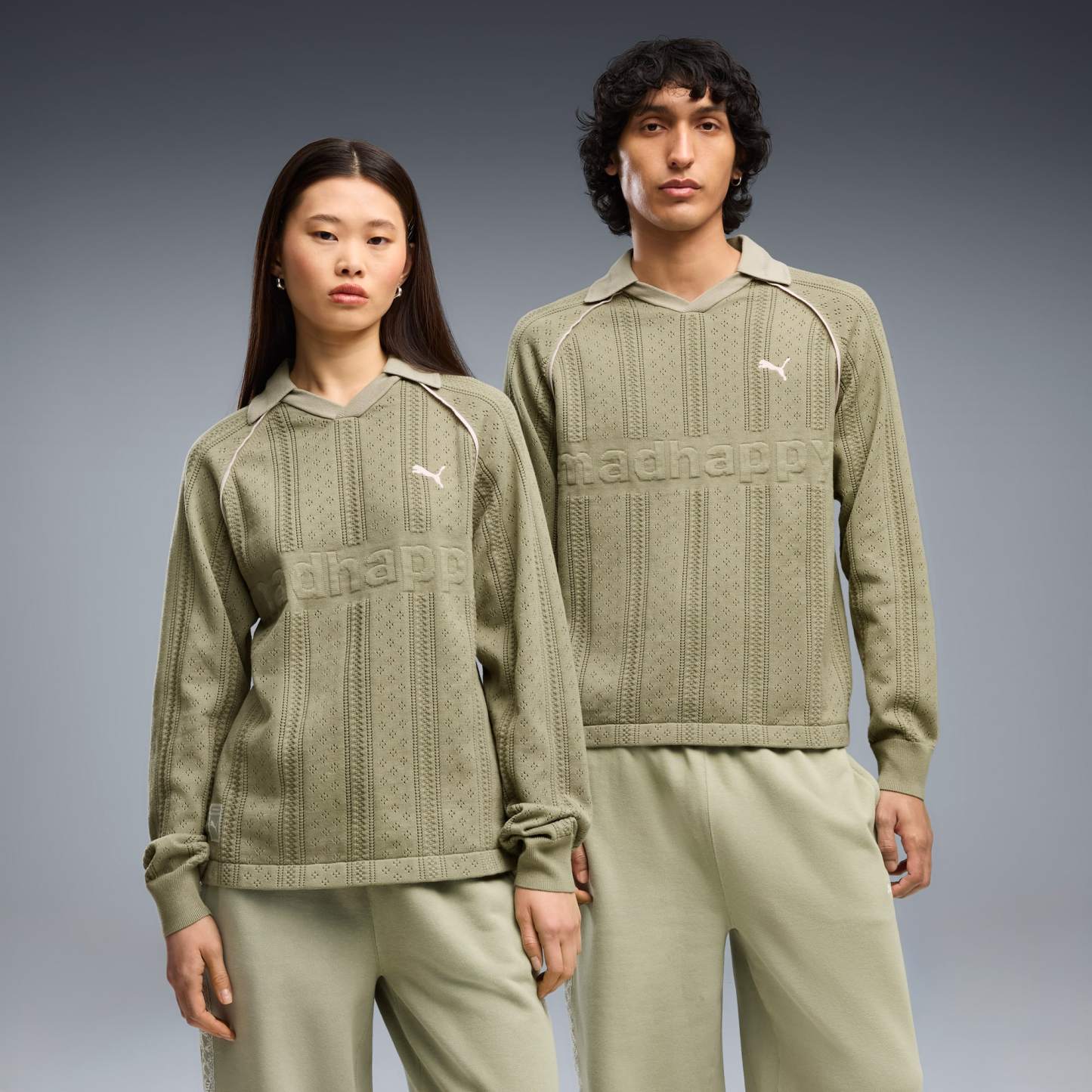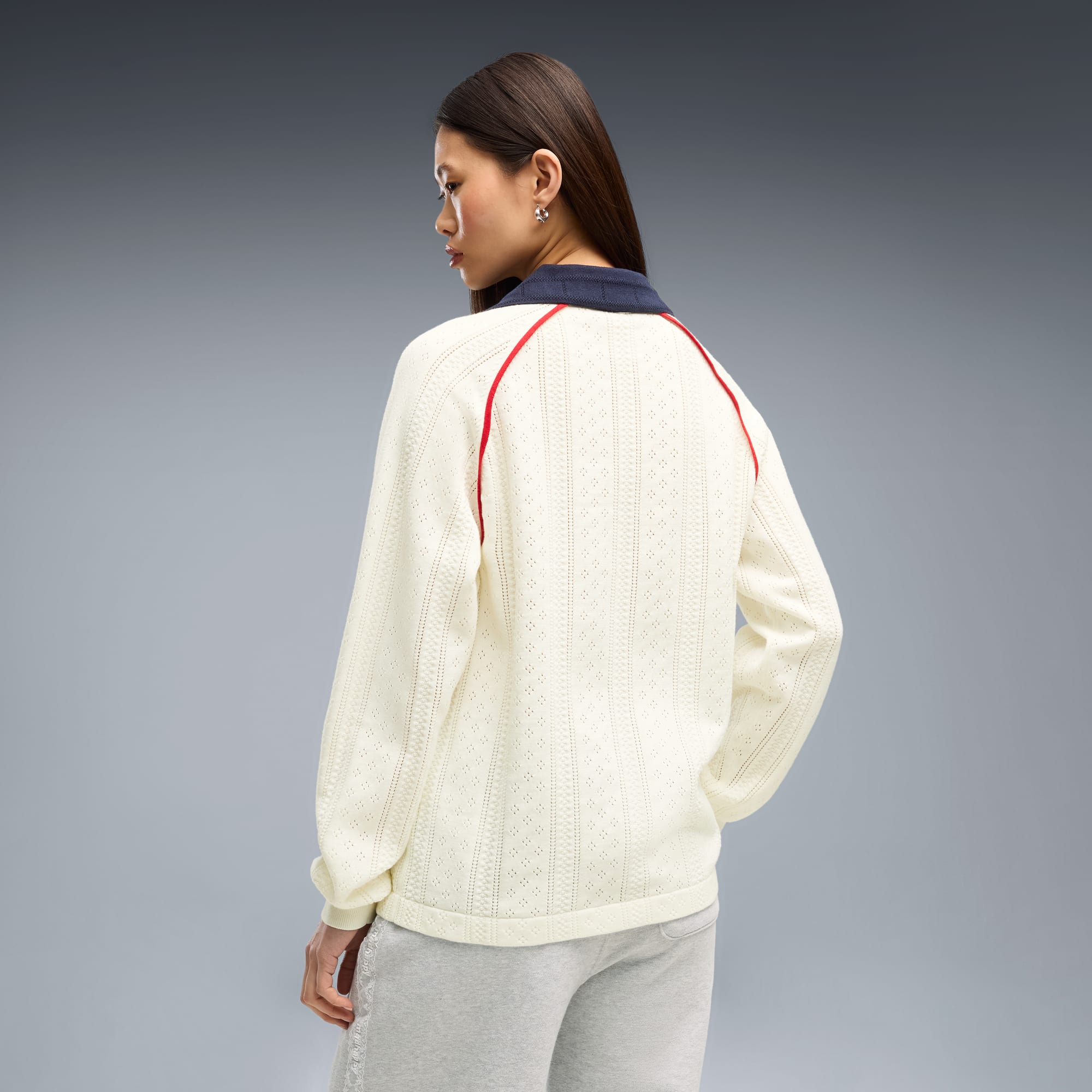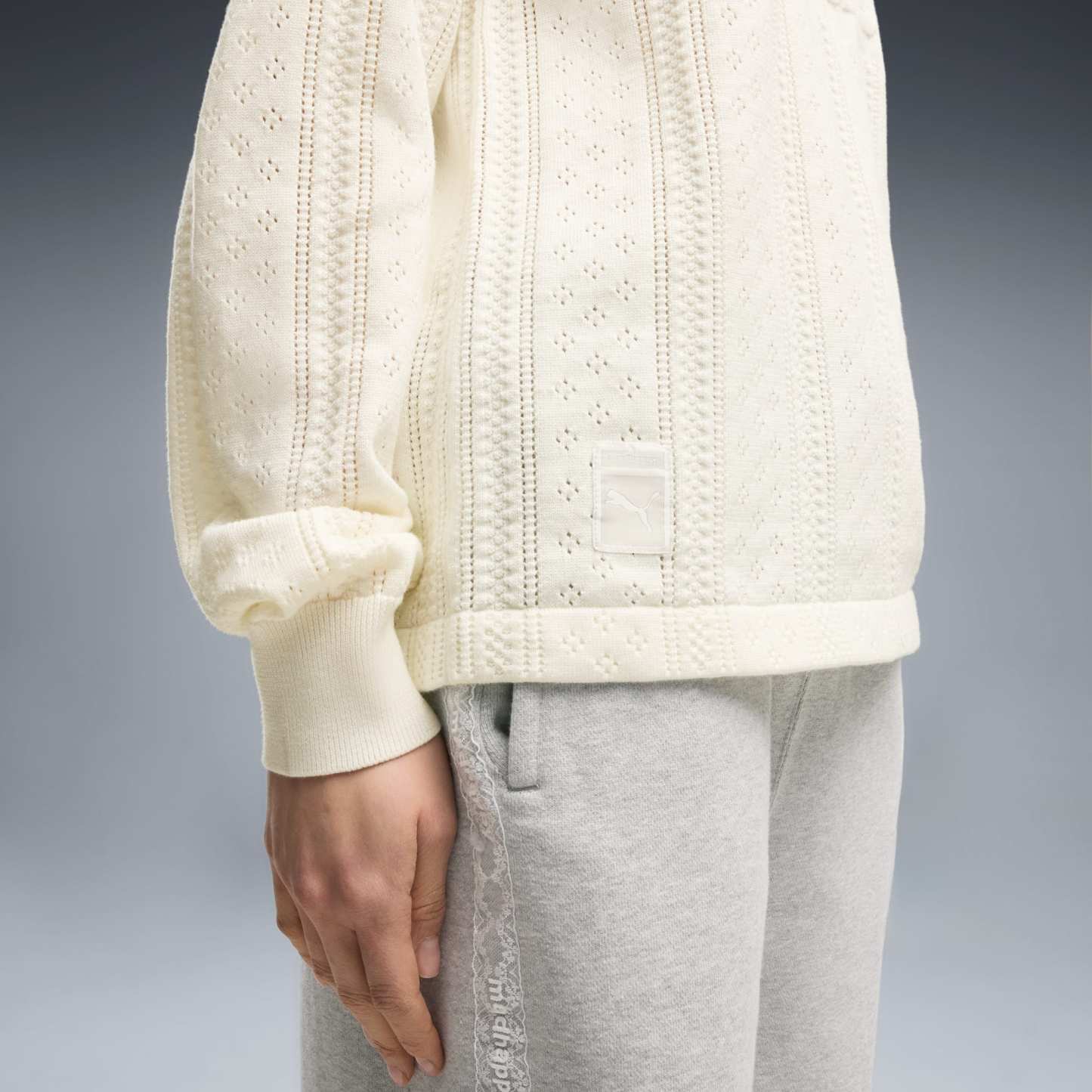 Good vibes only. The PUMA x MADHAPPY collection consists of classic sportswear and feel-good loungewear designed to lift the mood. Elevated details like pointelle and lace add softness and texture to athletic silhouettes. This long sleeve jersey brings that spirit to match-day style, reimagining a classic football jersey in soft and breathable pointelle knit.