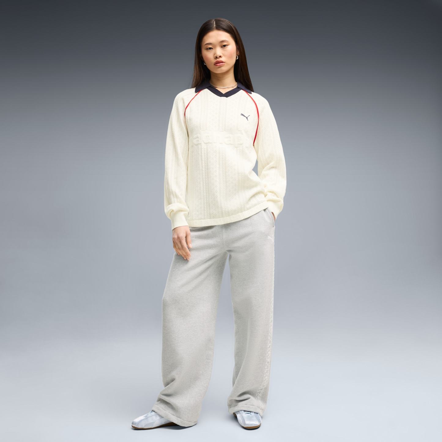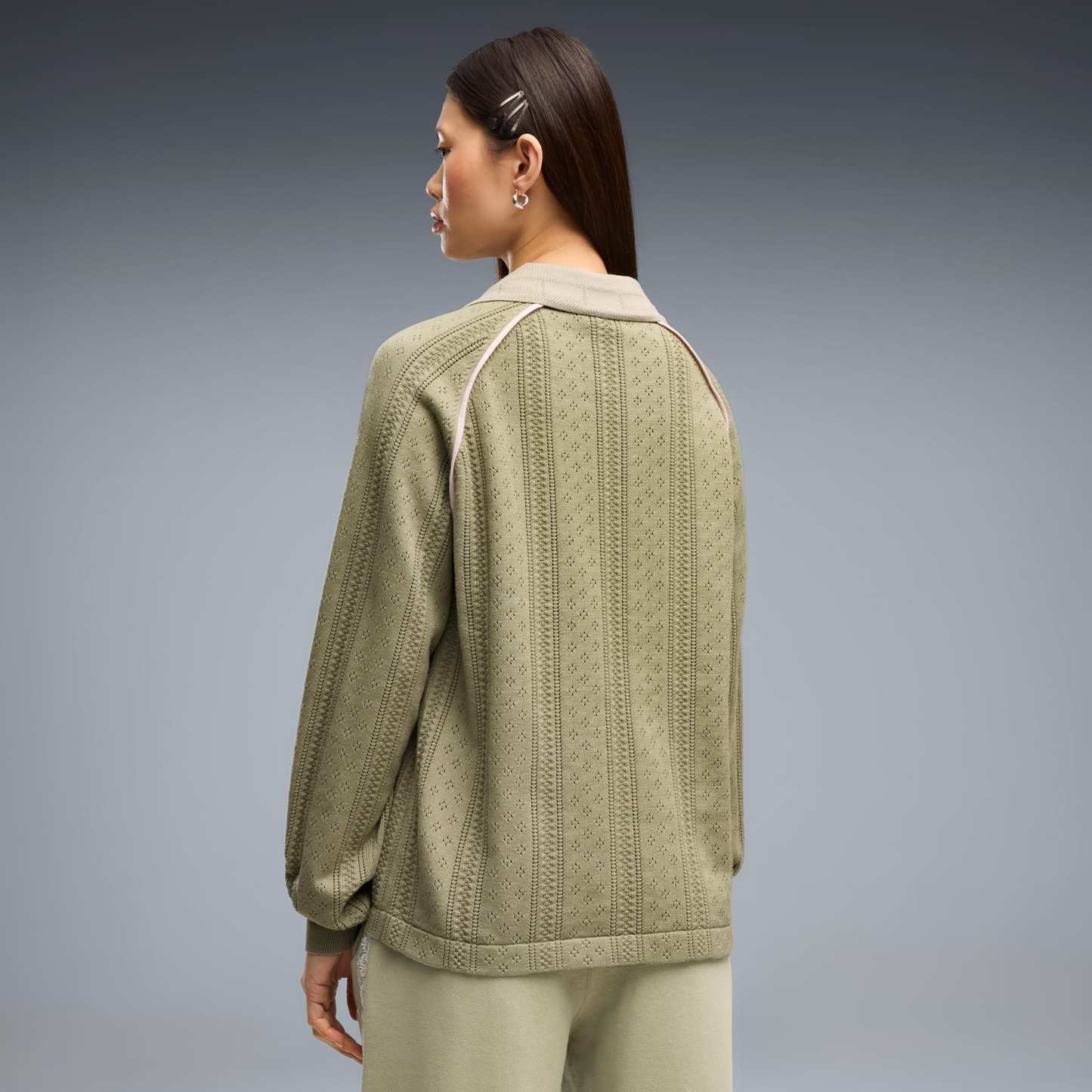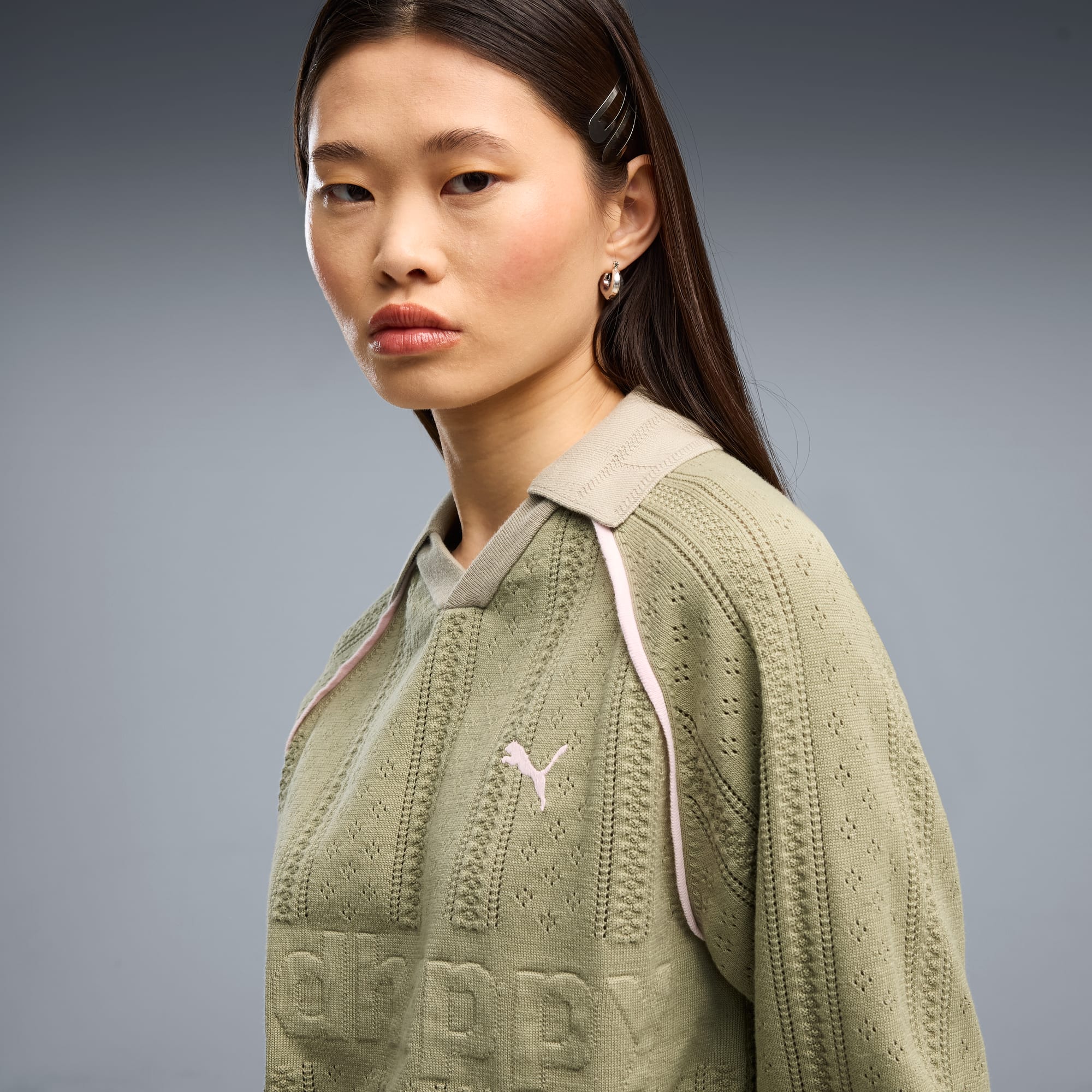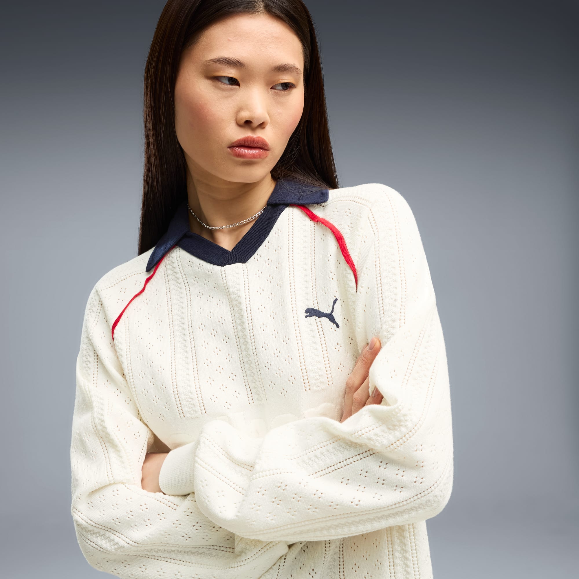 Good vibes only. The PUMA x MADHAPPY collection consists of classic sportswear and feel-good loungewear designed to lift the mood. Elevated details like pointelle and lace add softness and texture to athletic silhouettes. This long sleeve jersey brings that spirit to match-day style, reimagining a classic football jersey in soft and breathable pointelle knit.